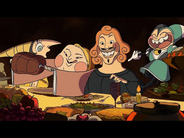 A group of guests are enjoying an exuberant feast, orchestrated by a mysterious violinist; but are they not enjoying themselves a little too much?